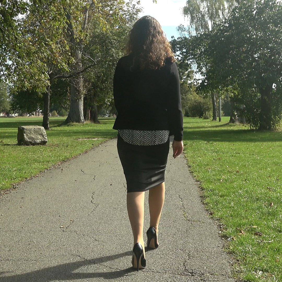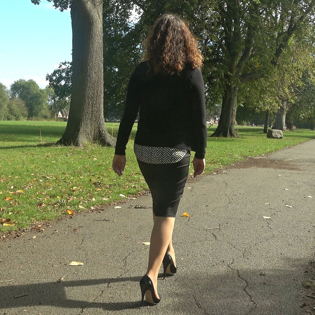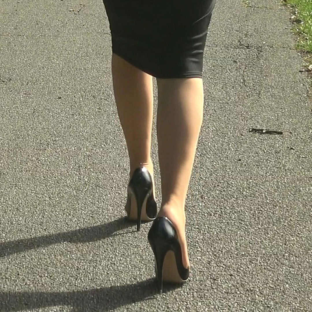 Listen to her black patent high stiletto with the classic low cut slimline look. How high are the heels ? Watch and find out now as every tap of her stiletto teaches you lessons about high heels inch by inch. Note how she has to walk so carefully because she wears such a high heel.